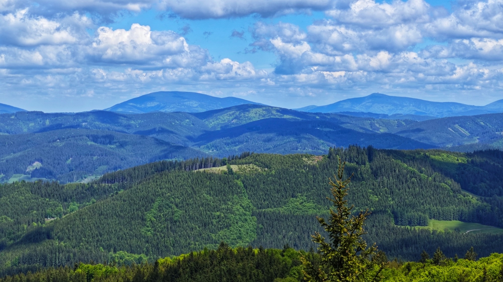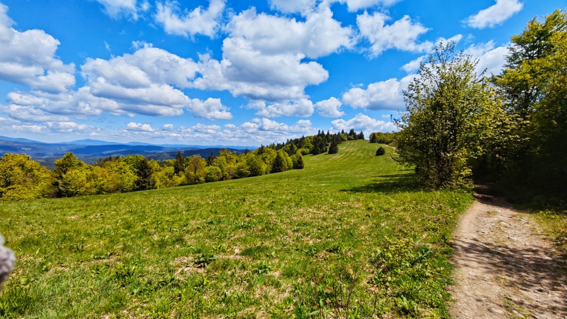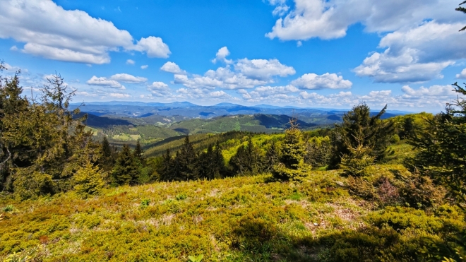 Jedeme přes jednotlivé vrcholky a sem tam se nám naskytne výhled v severu na Beskydy. Občas vzhůru projíždíme kamenitou stezkou, jako na kopec Beskyd (892 m n. m.). Za rozcestím Šerhovna, což přečtu vytesané na lavičce omylem jako Serhovna, již před sebou máme Tanečnici (912 m n. m.). Nejvyšší vrchol na dnešní trase. Tanečnice má vlastně vrcholky dva, mezi kterými projedeme k Soláni. Nejprve nás ale potěší krásný vyhlíd do okolích hor.