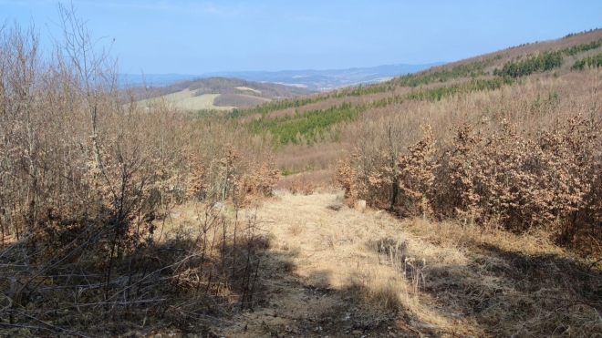 Posilněný vyrážím po cyklotrase vzhůru údolím Želechovského potoka. Někde na rozdrbaném hřebenu vpravo ode mne tuším kámoše. Jako bych až sem dolů slyšel hlasité funění Václava, jak s sebou tahá do krpálu po červené k Janově hoře svoji lehkou nadváhu. Na červenou značku se dostávám posléze také já. Jen na pár set metrů, neboť ona míří na Spletený vrch, který cyklotrasa lesem traverzuje. I tak se dostávám do téměř stejné výšky (530 m n. m.), odkud se dostanu k hájovně u Horní Lhoty.