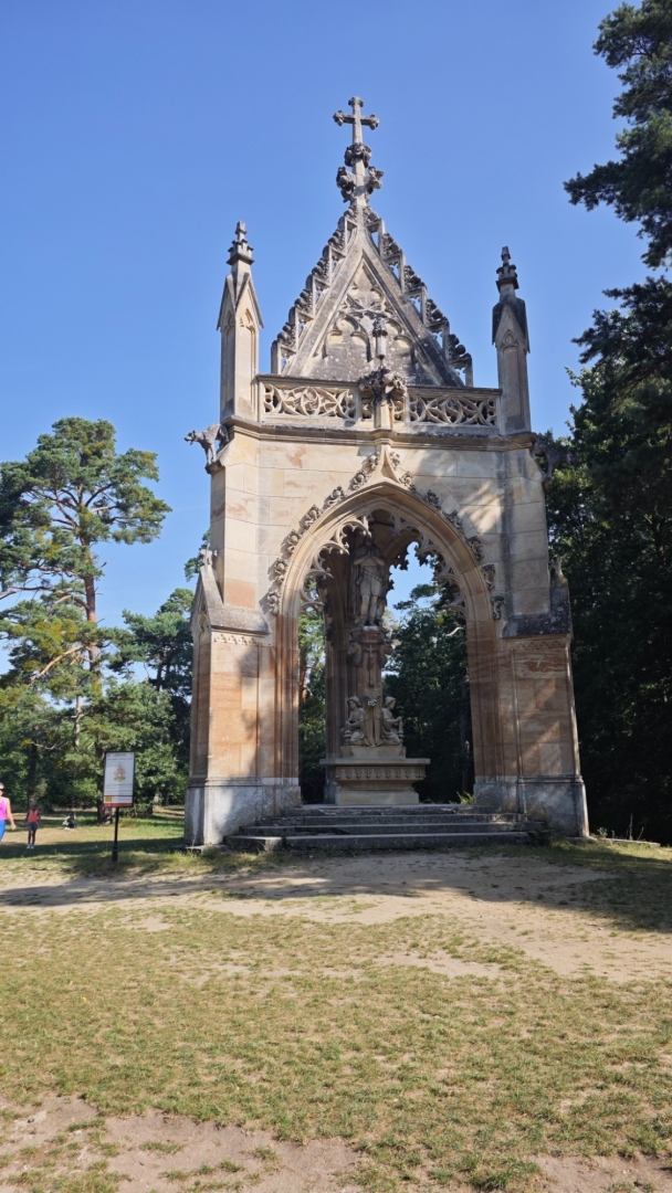 Vracíme se zpět do lesů Lednicko-valtického areálu, jenž byl zapsán na seznam dědictví UNESCO. Knížata z Lichtenštejnu zde po sobě zanechali velký park s mnoha stavbami barokní architektury. U jedné z nich zanedlouho zastavujeme. Novogotická otevřená kaple Svatého Huberta v Bořím lese chrání sochy F. Bauera a na první pohled je spíš altánkem. Nejasné značení cyklotras způsobí další omyl, když místo k zámečku Rendes - Vous zamíříme znovu k Břeclavi. Dianin chrám tedy zůstane našim očím skryt. Dlouhou trasu upravujeme, přece jen přes 80 km se nám v dnešním horku jet nechce.