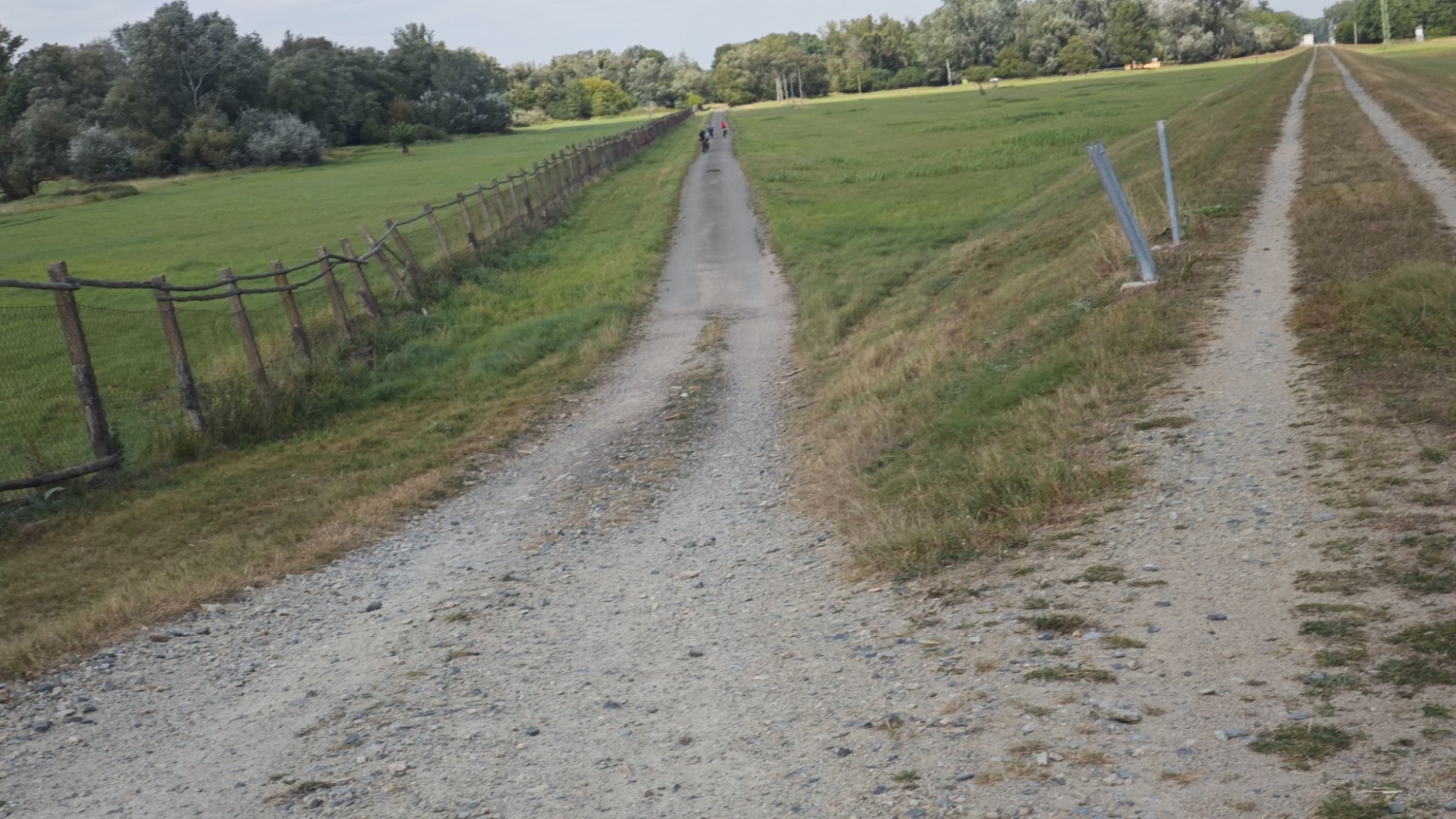 Míříme k soutoku Moravy a Dyje. Vedro je naštěstí často umírněno lesním stínem nebo vanoucím větrem. Vichr okusíme naplno pod Bořím dvorem, kde se nás snaží srazit zpět do listnatého lesa. Necelý kilometr nám stačí, abychom se rádi mezi vzrostlé duby znovu ukryli. Jedeme Vojenskou cestou, proto občas drncáme po panelech. Hranice s Rakouskem je blízko. Tahle malá odbočka má pro nás jednu výhodu. Nevezeme si s sebou nic k jídlu ani k pití a tak nám blízká benzinka bodne. Kupuju klobásu v bagetě a broskvový čaj, který mohu prostrčit na nosiči do spirály zámku. To se Jirkovi nedaří a tak musí svoji pet láhev rovnou vypít.