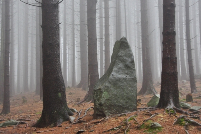Od parkoviště v Javorníku, který leží ve výšce 960 m n. m., jdeme kousek po kostkami vydlážděné cestě, a následně souběžně po příjemnější lesní cestě. Už tady objevujeme mnoho kamenů, i menší kamenné moře skryté ve svahu nad námi. Kolem padají kapky z vysrážené mlhy, kterou pochytaly stromy v okolí. Snímky v mém Nikonu tak dostávají zvláštní intimní atmosféru. Fotím z ruky a tak musím hodně zvýšit citlivost a občas i zakleknout do stabilní polohy nebo se zapřít o strom, abych neměl všechny obrázky mázlé.